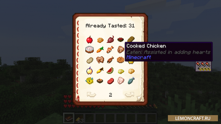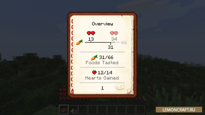 Мод на увеличение здоровья Spice of Life: Carrot Edition дает вам возможность увеличить свое здоровье на 10 единиц путем поедания разной еды. Суть мода в следующем, чем разнообразнее ваш рацион, тем больше у вас здоровья. В настройках мода вы сможете настроить максимальное количество здоровья и количество блюд, которое требуется съесть для получения очередного сердечка.