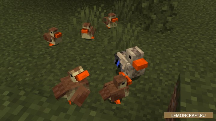 Мод на уток и гусей Untitled Duck добавляет в игру новых персонажей, уток и гусей, а так же несколько предметов непосредственно связанных с ними. Уток вы сможете разводить используя семена, а с самих уток получите перья. Так же утки умеют плавать, а если рядом с ними включить проигрыватель, начнут танцевать. Гусей так же можно разводить семенами, а приручать с помощью водорослей. Гуси отпугивают обитателе, как кошки криперов, а так же могут, как в реальной жизни, напасть на вас и выхватить находящийся у вас в руках предмет.