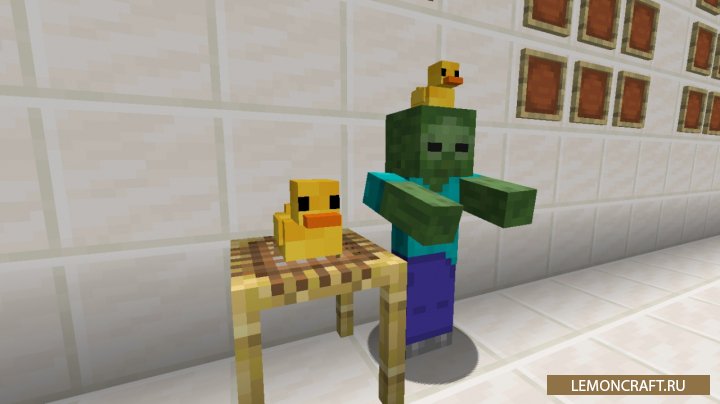 Мод на резиновую уточку Rubber Duck добавит в игру нового, прикольного персонажа, резиновую утку, которая может появится, как на головах зомби, так и на головах скелетов. Так же вы сможете обнаружить ее в сундуках, находящихся в подземелье. Если на уточку нажать, она издаст прикольный звук.