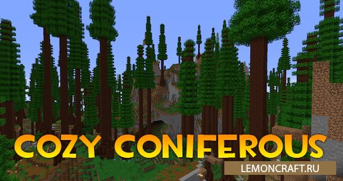 Мод на хвойные деревья Cozy Coniferous Добавляет в игру новые виды деревьев (ели, сосны и секвойи) и уникальные биомы, где данные деревья могут произрастать.