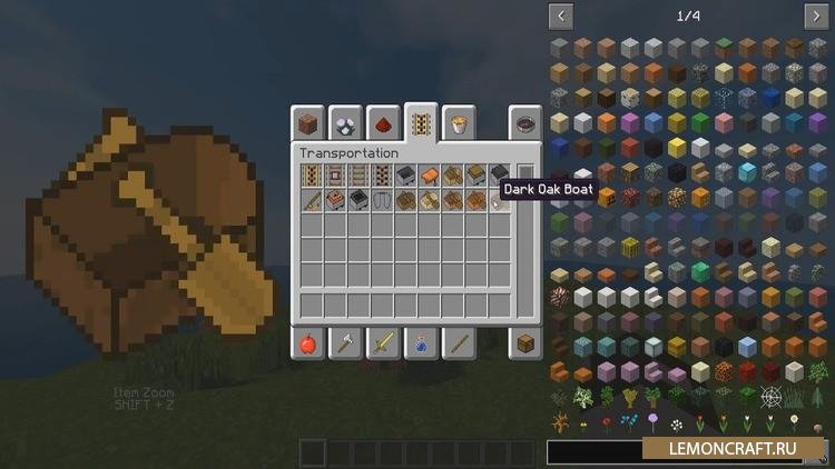 Мод ItemZoom позволяет увеличить вид блока в меню. Зачем это нужно? Данная функция пригодится тем у кого очень большое количество модов.